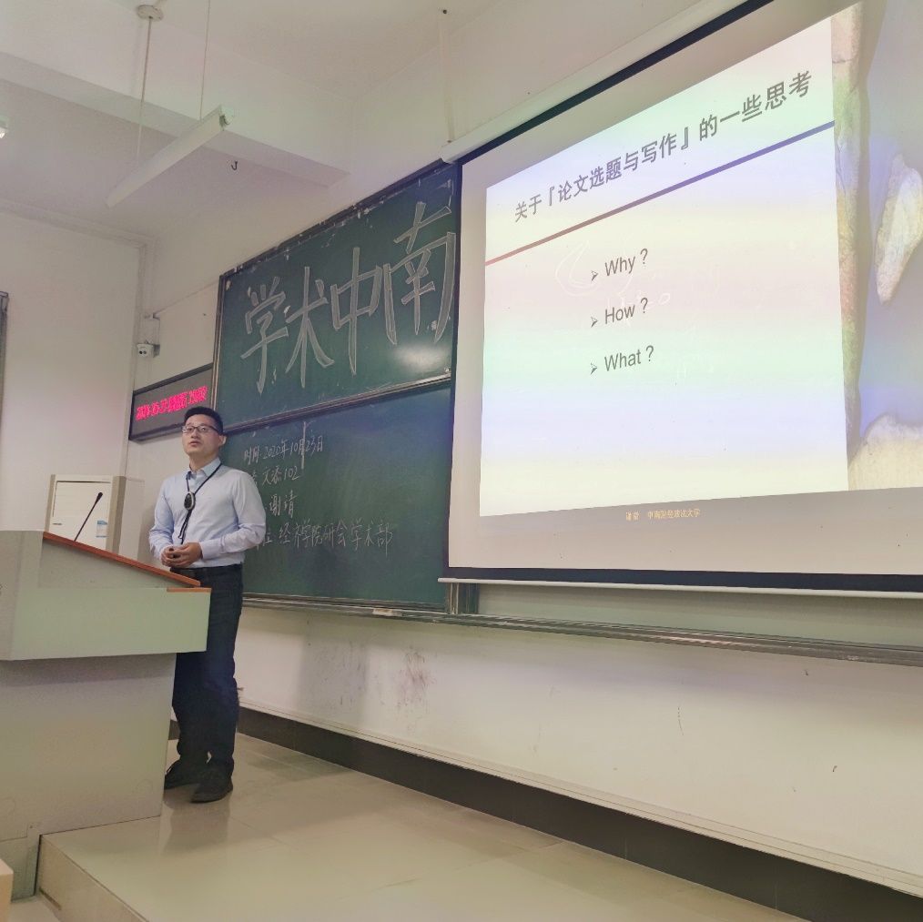 (通讯员:张瀚文 熊保维;摄影:赵雪杰)2020年10月23日晚上7点,学术中南第一期:“关于论文选题和写作的一些思考”讲座在文添楼102成功举办。本次讲座由三公牌 研究生会学术部成员熊保维主持,主讲嘉宾是现任三公牌-三公技巧 研究生导师谢靖。