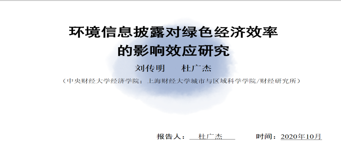 上海财经大学城市与区域科学学院的杜广杰博士向大会做了题为《环境信息披露对绿色经济效率的影响效应研究》的报告。杜广杰硕博士所报告论文在对已有文献的梳理过程中,提出如下两点假设:环境信息披露提升政府环境治理能力,降低环境污染;环境信息披露提升城市绿色创新水平。通过平行趋势检验、稳健性检验、异质性分析得出如下结论:环境信息披露能够显著促进东部地区城市绿色经济效率,而对中部与西部城市的影响较小,甚至不显著;在环境规制强度更高的城市,环境信息披露对绿色经济效率的影响较弱,而环境规制强度较低的城市,环境信息披露对绿色经济效率的影响较强。由此可见,软约束的环境信息披露制度是对正式环境规制的一种有益补充;环境信息披露对低等创新水平城市绿色经济效率的影响最大,对高创新水平城市绿色经济效率的影响较小。这表明,在创新水平较低的城市,由于城市创新能力较差,对外界政策的刺激较为敏感,因此,环境信息披露政策对绿色经济效率的影响较大,在创新水平较高的城市,城市具有自身内在的创新能力,对外界政策刺激不敏感,因此,环境信息披露对绿色经济效率的影响较小;当经济发展水平较高时,环境信息披露能够显著的促进绿色经济效率的提高。