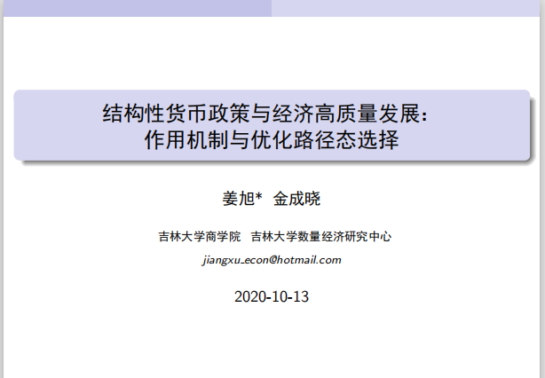 吉林大学商学院的姜旭博士向大会做了题为《结构性货币政策与经济高质量发展: 作用机制与优化路径态选择》的报告。姜旭博士认为既有文献大多针对某仐种或几种结构性货币政策工具分别单独研究,而鲜有文献将结构性货币政策作为一个整体进行数量分析。结构性货币政策致力于解决我国经济金融领域中的结构性失衡问题,因此对于相关政策的效果评价,应以经济高质量发展的视角来进行衡量,相关指标应突出供给侧结构性改革的特点,同时注重与总量货币政策的区别,重点考察其政策效果与作用机制;我国的各类结构性货币政策实践表现出明显的阶段性特征,且在我国经济“新常态”背景下,供给侧结构性改革和宏观调控模式转型的特点较为突出,需要对其时变效应及政策效果的阶段性变迁展录考察。姜旭博士通过实证检验与政策分析得出如下结论:我国近年来的结构性货币政策受自身发展和外部经济环境等因素的影响,其结构性变迁大致可分为五个阶段,并主要沿着“拓宽基础 货币投放渠道、补充流动性不足——完善央行流动性调控机制、畅通政策传导 渠道——促进经济结构转型升级、助力经济高质量发展”的路径进行发展,在政策目标、政策特点、政策效果等方面,均与传统的总量货币政策有着较大不同。结构性货币政策冲击对于经济高质量发展的影响主要体现在中长期,这与传统货币政策以短期调控为主的特点也存在明显区别。在传导渠道方面,结构性货币政策更多的是通过利率及信贷渠道对经济高质量发展水平产生影响,相比总量货币政策更具市场化特点,且具有价格型调控的特征,其通过增强利率 引导、优化信贷结构,为供给侧结构性改革和经济高质量发展营造了良好金融 环境。2018年末以来,结构性货币政策对于高质量发展的支撑效应出现下滑,但这主要是由于货币政策整体有效性不足以及结构性改革的难度上升,就结构 性货币政策自身而,其随着时间的推移,政策效果徜始趋于稳定,这表明央 行对于结构性货币政策工具的运用日渐成熟。