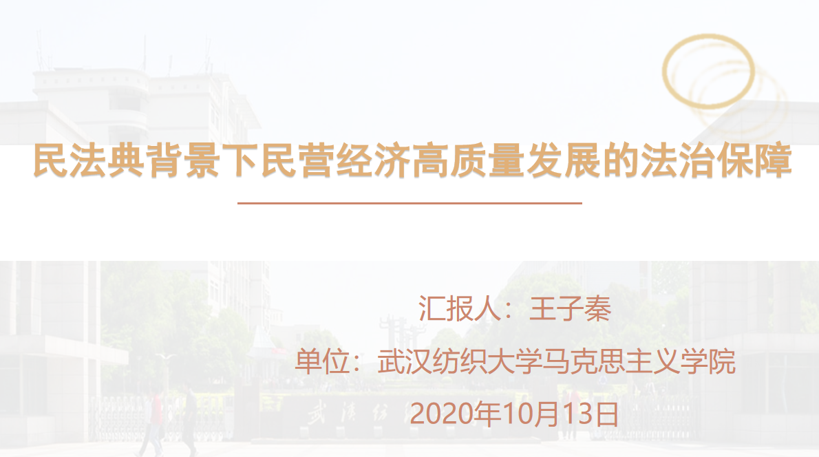 武汉纺织大学马克思主义学院王子秦作了《民法典背景下民营经济高质量发展的法治保障》的报告。王子秦同学表示在推动完善社会主义市场经济体制的过程中,对民营经济的制度保障尤为重要,尤其是2014年党的十八届四中全会做出“社会主义市场经济本质上是法治经济”这一重要论断,更加明确法治对发展民营经济的重要意义。他提出实现民营经济高质量发展的法治对策:1.完善民营经济相关立法2.强化法律实施3.构建法治化营商环境4.培育企业家精神。在最后王子秦同学指出《民法典》对民营经济高质量发展的重大意义:1.对个体权利的尊重2.“以人民为中心”的价值导向3.推进全面依法治国、推进国家治理体系和治理能力现代化的重要举措。