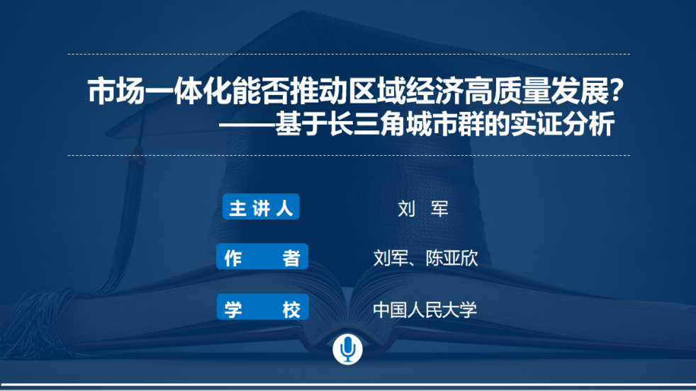 中国人民大学的刘军向大会做了题为《市场一体化能否推动区域经济高质量发展?——基于长三角城市群的实证分析》的报告。刘军从绿色全要素生产率的视角出发,运用空间计量模型,构建交互项主要探究市场一体化对经济质量影响的理论传导机制。刘军硕士所报告论文在对已有文献的梳理过程中,提出如下几点假设:市场一体化通过规模效应,对经济增长质量起到正向作用;市场一体化通过产业升级,与经济增长质量之间呈现正比关系;市场一体化通过协同创新来提升经济增长质量。通过市场一体化分析、GTFP空间布局分析、空间相关性检验、空间计量回归、影响效应分解、稳健性检验得出了以下结论:关于市场一体化指标的测算,2003-2016年长三角城市群整体市场一体化指数年际变化大,呈现波动性上升趋势;关于绿色全要素生产率的测算,GTFP呈现出时间与空间上的特征;全局Moran指数整体呈现递减趋势,而局部Moran指数中,两种空间权重矩阵均显示GTFP大多数集聚于第一、三象限,呈现高高、低低的特点;生产要素层面上的规模效应与经济质量呈反向关系;产业结构层面上的产业升级对经济质量影响弹性高达0.6565;区域合作层面上的协同创新与经济质量呈正比趋势;长三角城市群内部技术创新溢出效应明显。