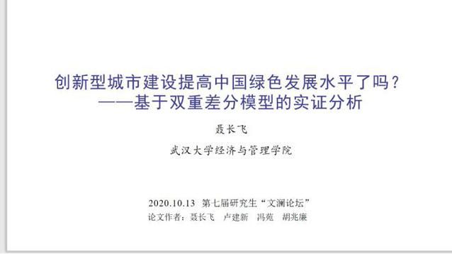 武汉大学经济与管理学院的聂长飞博士作了《创新型城市建设提高中国绿色发展水平了吗?——基于双重差分模型的实证分析》的报告。聂长飞博士生表示因为中国环境形势不容乐观,党和政府已经将绿色发展的重要性提到了前所未有的高度因此提升绿色发展水平的现实意义。本研究试图回答一下问题:创新型城市建设能否提升试点城市的GTFP?如果答案是肯定的,那么创新型城市建设的绿色发展效应是否存在异质性?创新型城市建设是通过哪些途径影响GTFP的?文章通过异质性分析并进行平行趋势检验、PSM-DID估计、反事实检验、安慰剂检验等稳健性检验得出以下三个结论:第一,相较于非试点城市,政策试点使得绿色全要素生产率平均提高4.9%。,意味着创新型城市建设有利于推动中国经济发展的绿色转型。第二,机制分析表明,创新型城市建设可以通过技术效应、集聚效应和倒逼效应三条途径提升城市绿色发展水平。创新型城市建设对GTFP的影响具有异质性,总体而言,创新型城市建设的绿色发展效应在东部地区的城市、城市规模较大的城市以及城市等级更高的城市中影响更加显著;同时,随着城市GTFP的提高,创新型城市建设对城市绿色发展水平的边际效应具有不断增强的趋势。