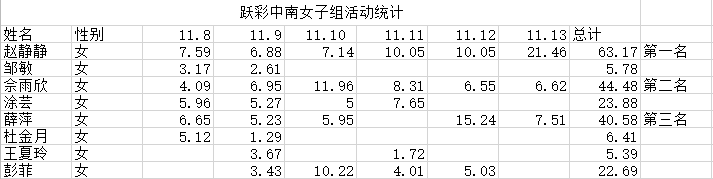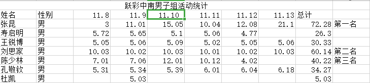 根据每日跑步公里数累计结果,共评选出6位获奖候选人,其中女子组、男子组分别一等奖、二等奖、三等奖各一名。