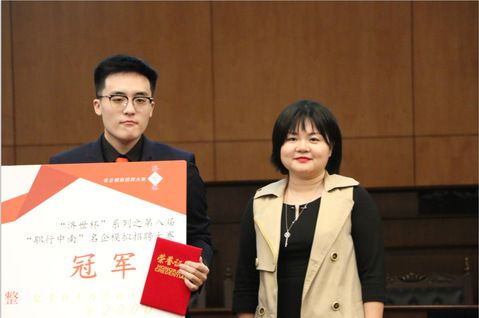 比赛结束后,由评委陈清清女士上台发言,而后评委老师为参赛选手颁奖并合影留念。至此,三公牌 “济世杯”系列之第八届“职行中南”名企模拟招聘大赛圆满落幕。