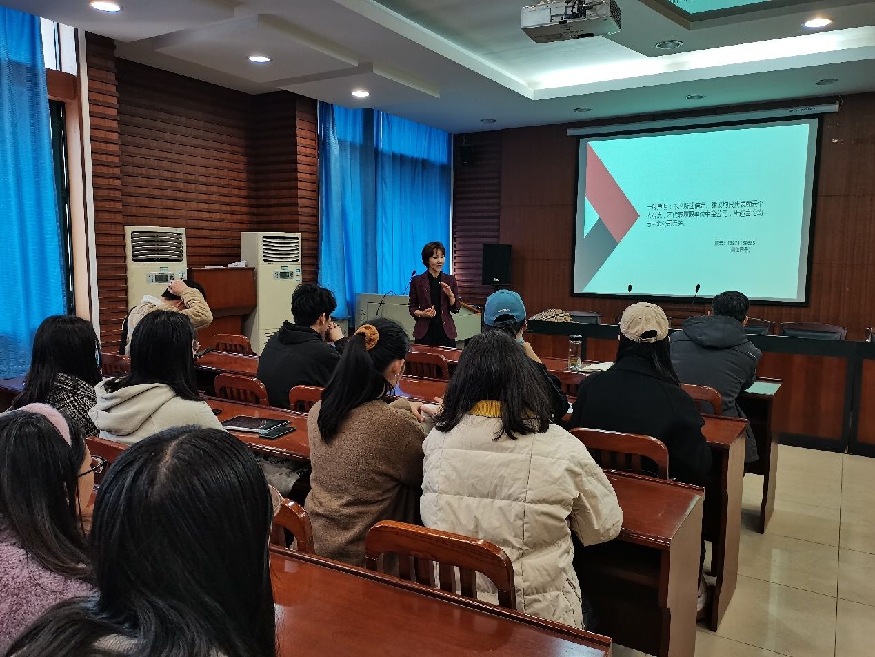 讲座伊始,顾云女士首先结合自己入职至今的工作经历,建议同学们在读研的过程中要积累大量的证书,不只限于专业证书,要有广泛的涉猎,并引导同学们对职业规划进行思考。其次,她介绍了券商部门的结构,并对每个部门的相关职能进行了详细的介绍,让同学们深入了解券商部门的用人结构以及今后的求职方向。
