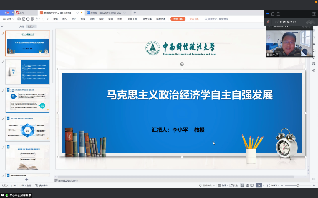 李小平教授提出了五点看法。一是自立自强发展的必要性。一方面这是国家发展建设的需要,另一方面也是理论自信的需要。二是当代中国马克思主义政治经济学发展面临的新形势。三是中国特色社会主义政治经济学的研究成效。四是全面推进中国特色社会主义政治经济学学科建设。最后,他介绍了本校马克思主义政治经济学学科建设情况。政治经济学学科近几年取得了较快发展,但与兄弟院校相比,还存在教学教师队伍结构失衡、力量不足,缺乏领军人才,与国内外著名高校互动互访学术合作和交流较少,政治经济学智库成果和影响力不够,以及本科生、研究生的政治经济学教学有待加强等问题。