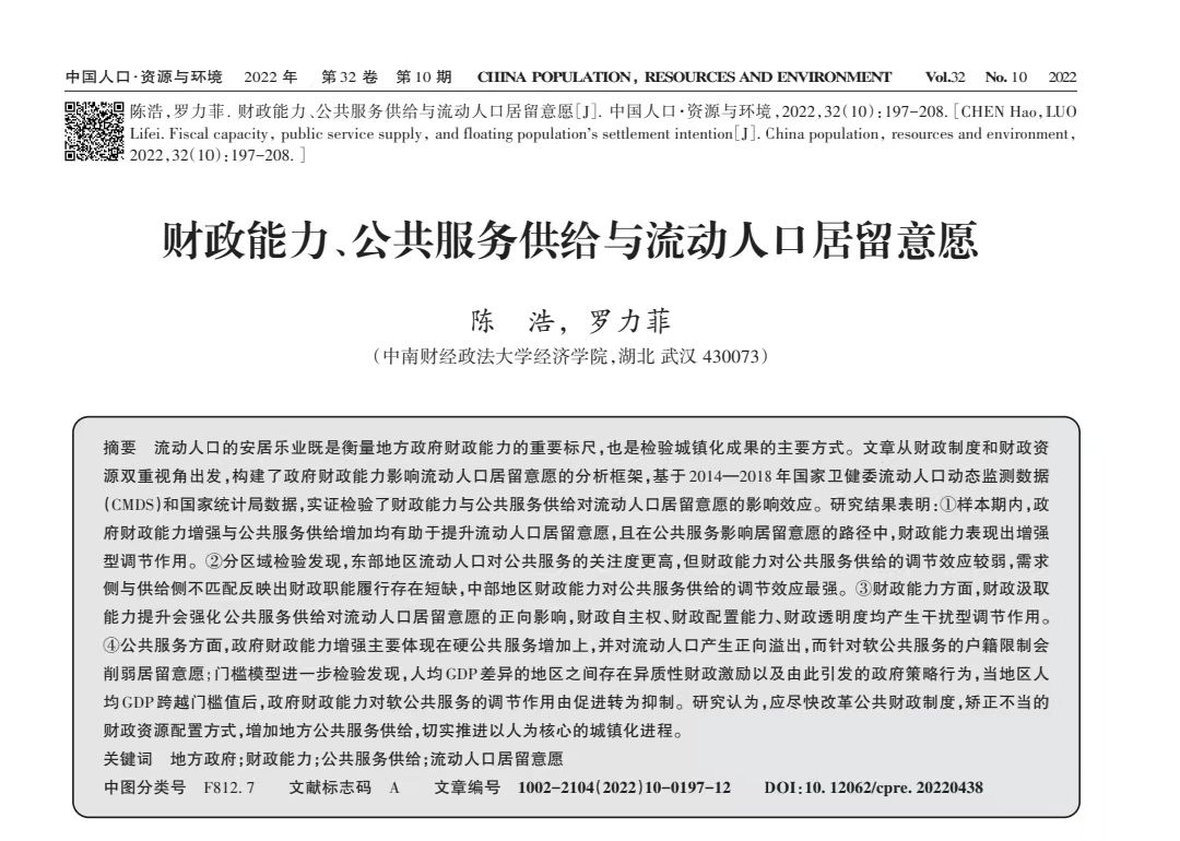 2022年10月,三公牌 陈浩教授合作论文《财政能力、公共服务供给与流动人口居留意愿》在期刊《中国人口·资源与环境》上正式刊出。