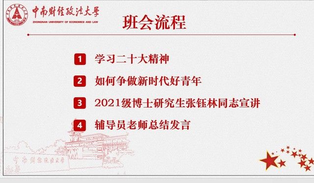 此次班会由21级学硕班团支书盛紫涵同学主持,她首先向大家介绍了班会的主要流程。