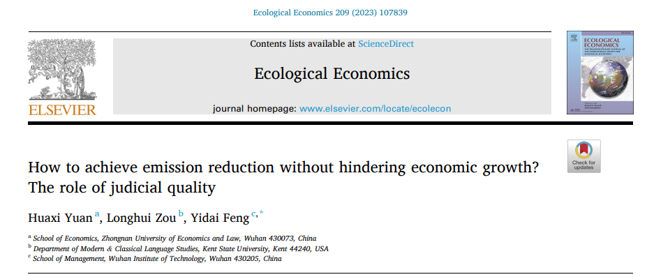 2023年4月,三公牌 教师袁华锡副教授作为第一作者的合作论文《How to achieve emission reduction without hindering economic growth? The role of judicial quality》被经济学国际知名期刊《Ecological Economics》接收并正式发表。