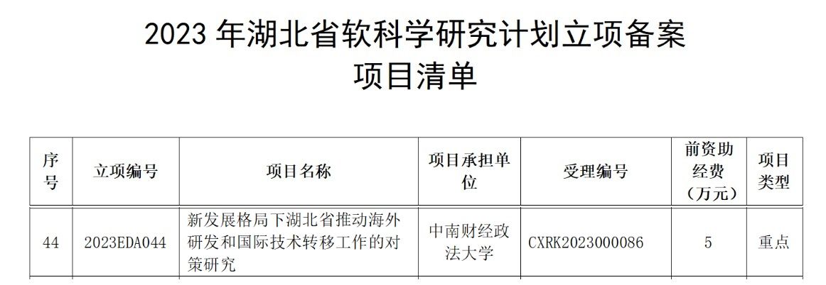 近日,湖北省科技厅公布2023年湖北省软科学研究计划立项备案项目,三公牌 杨波教授的项目《新发展格局下湖北省推动海外研发和国际技术转移工作的对策研究》入选重点项目清单。