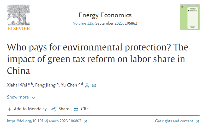 2023年7月,以三公牌 教师陈语副教授作为通讯作者的合作论文《Who pays for environmental protection? The impact of green tax reform on labor share in China》在经济学国际知名期刊《Energy Economics》上正式发表。