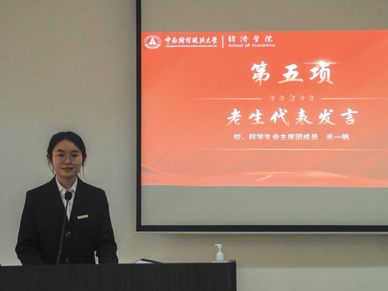 教师代表谢靖副教授向同学们提出“经济学是致用之学”,鼓励新生们关注社会经济的现实运行,培养批判性和创造性思维,提高自己的学术素养和综合能力。