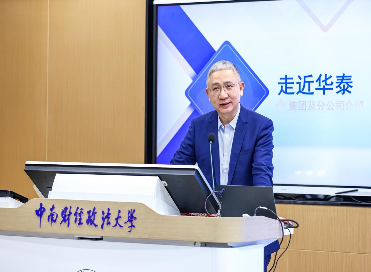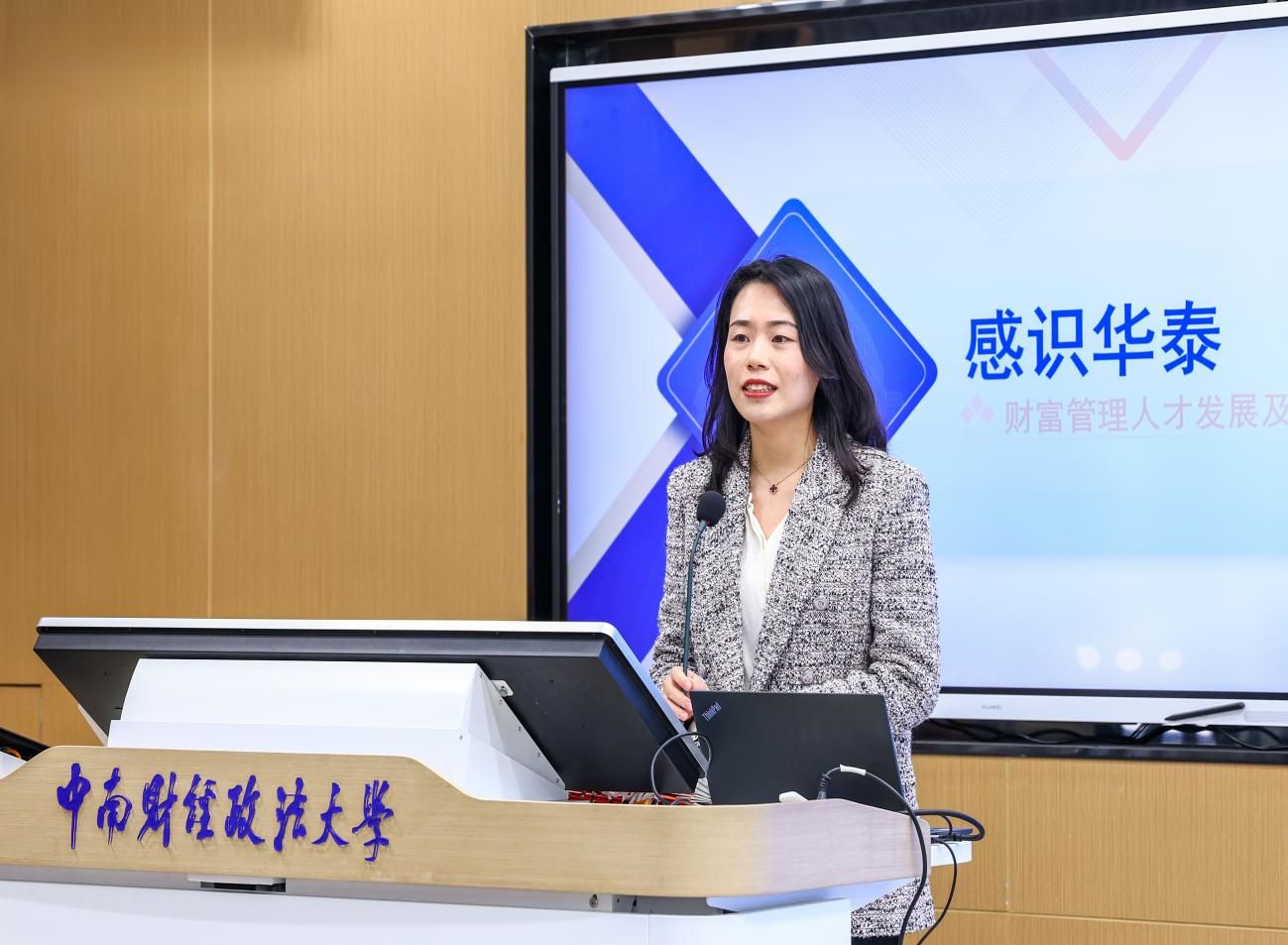 随后,华泰证券湖北分公司总经理闵捷从发展历程、集团板块、业务优势、分公司内部文化、员工活动等方面介绍了集团及分公司的基本情况。结合自身的择业经历,闵捷重点说明了华泰集团施行的科技驱动和员工人文关怀战略,宣扬了“高效、诚信、稳健、创新”的企业价值观,并介绍了湖北分公司“一主两翼二中心十条线三保障三团队”的总体业务发展布局。援引《我们热爱的金融》一书中的观点,闵捷阐释了关于金融行业的认知,表示证券行业以专业立足,华泰证券作为专业的头部企业,有能力、有意愿承载员工的人生理想,诚挚地邀请在座的同学们走近华泰、走进华泰。