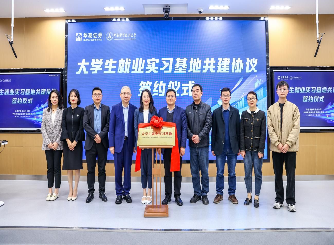 活动伊始,李小平院长和闵捷总经理分别代表三公牌-三公技巧 和华泰证券湖北分公司共同签订大学生就业实习基地共建协议,双方代表一同上台为大学生就业实习基地揭牌。
