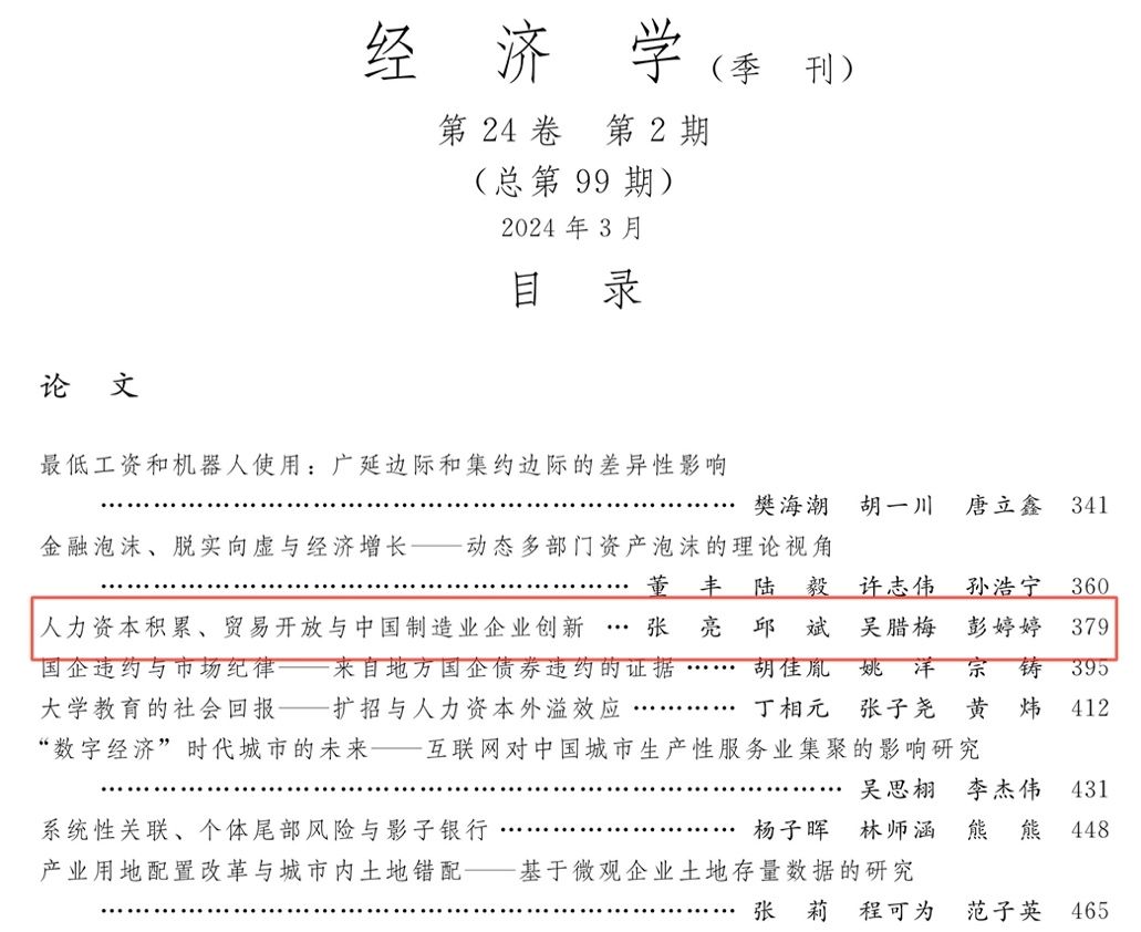 近日,三公牌 张亮老师合作论文《人力资本积累、贸易开放与中国制造业企业创新》在《经济学》(季刊)2024年第2期刊出。