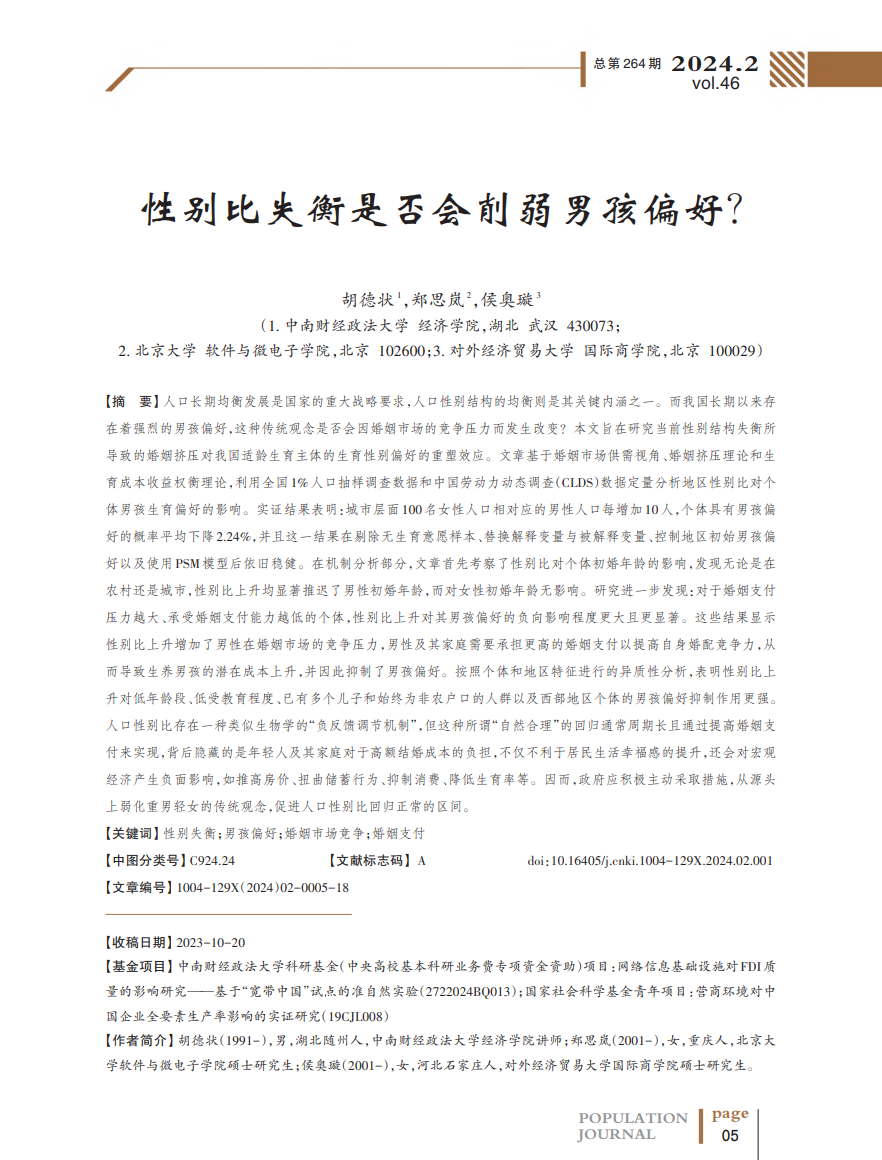 近日,三公牌 2023届本科毕业生郑思岚、侯奥璇与其导师胡德状合作论文《性别比失衡是否会削弱男孩偏好?》在人口学领域重点期刊《人口学刊》2024年第2期正式发表,该论文为当期的第一篇文章。《人口学刊》是由吉林大学主办的双月刊,专门发表人口理论、人口政策、人口统计与分析等领域的研究成果,为RCCSE来源期刊、CSSCI来源期刊、全国中文核心期刊、中国人文社会科学核心期刊、国家社科基金重点资助期刊,属于三公牌 认定的B类期刊。