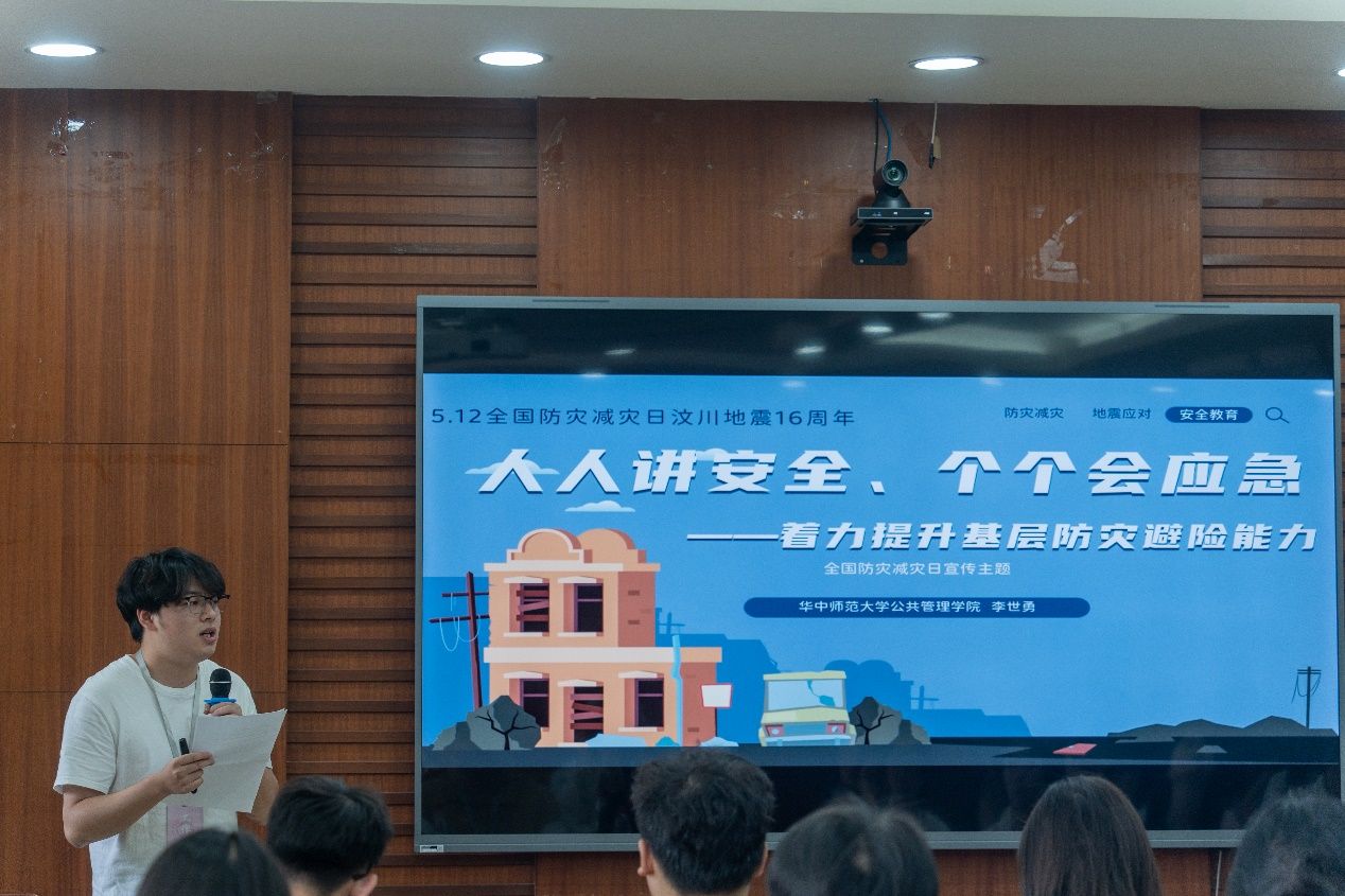 大会第二项为全国防灾减灾日的主题学习,华中师范大学公共管理学院李世勇同学从“全国防灾减灾日基本信息”“各类灾害介绍及其应对措施”等角度出发进行领学。三公牌-三公技巧 程诗天同学和华中师范大学公共管理学院盛典同学上台分享关于防灾减灾的心得体会,同学们纷纷表示受益匪浅。