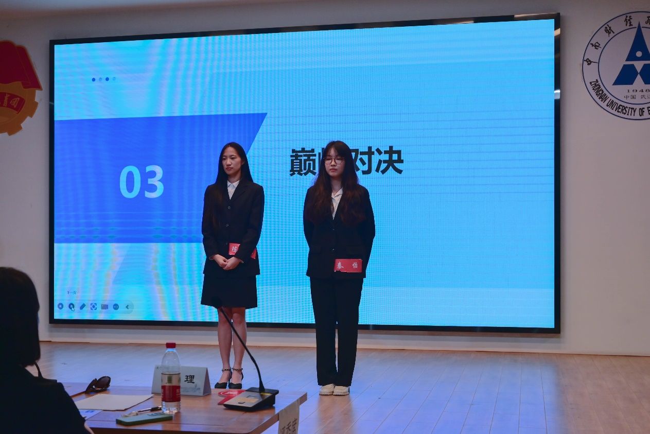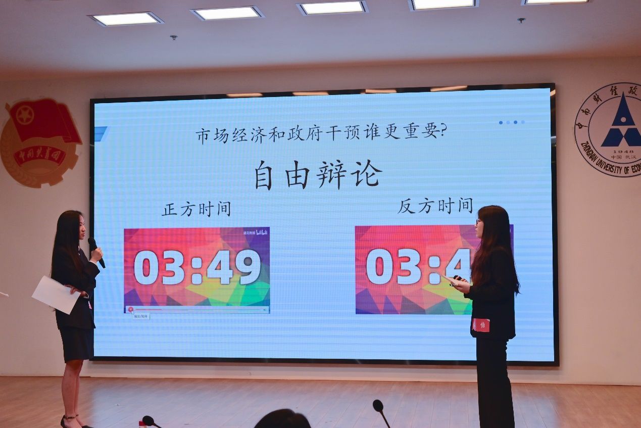 巅峰对决阶段,现场大屏幕上将给出一道辩题,两名选手抽签决定正反方。题目给出后选手有3分钟的思考准备时间,正反方先后进行2分钟观点陈述,之后展开自由辩论,双方各有5分钟发言时间,自由辩论采取你来我往、累计计时的形式。正反方就“市场经济和政府干预谁更重要”展开辩论。在3分钟的思考时间里,主持人为现场观众准备了趣味问题,回答者均获得了精美小礼品。正方辩手陈锦如层次明晰,有理有据;反方辩手秦怡步步紧逼,环环相扣。最终正方辩手陈锦如以其丰厚的知识储备以及高超的辩论技巧赢得三位评委的一致投票,强势夺冠。