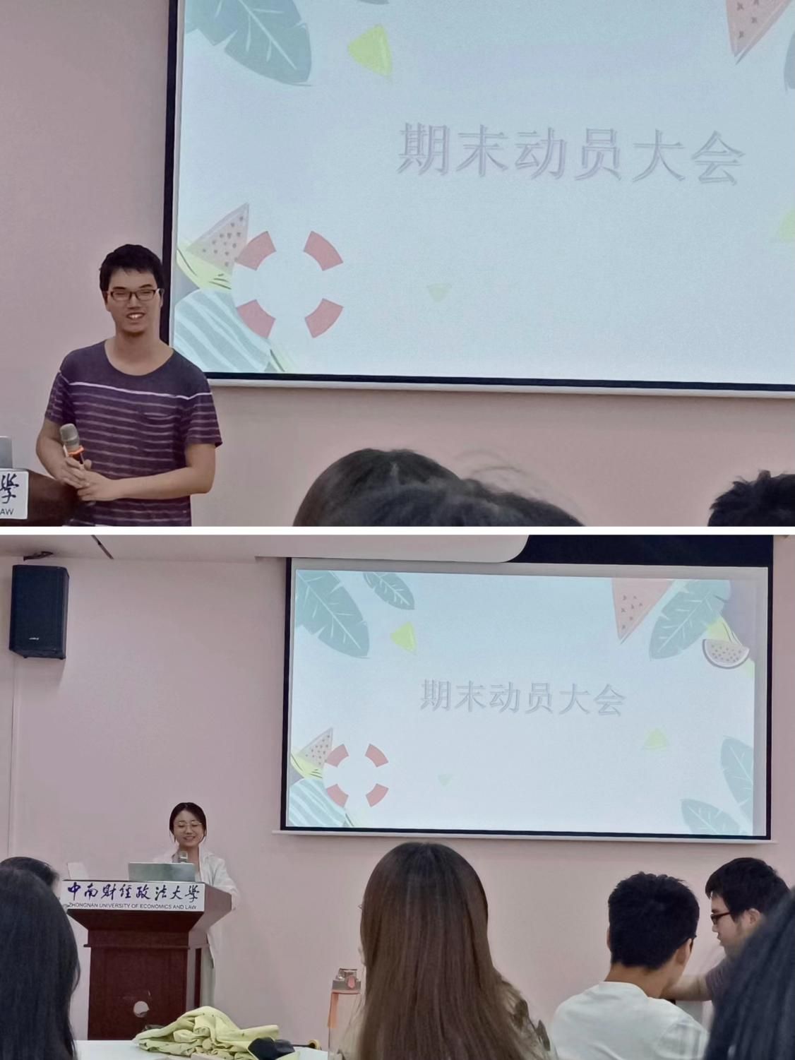 紧接着,两名学习成绩优异的学生代表上台进行了学习经验分享。舒旻阳同学突出讲述了他的时间管理方法和复习计划,强调了在复习过程中合理安排时间、注重效率的重要性。杨佳峰同学重点谈到了舍友间相互激励、共同学习的重要性,她鼓励同学们保持良好的学习习惯和积极的心态,相信自己一定能取得优异的成绩。