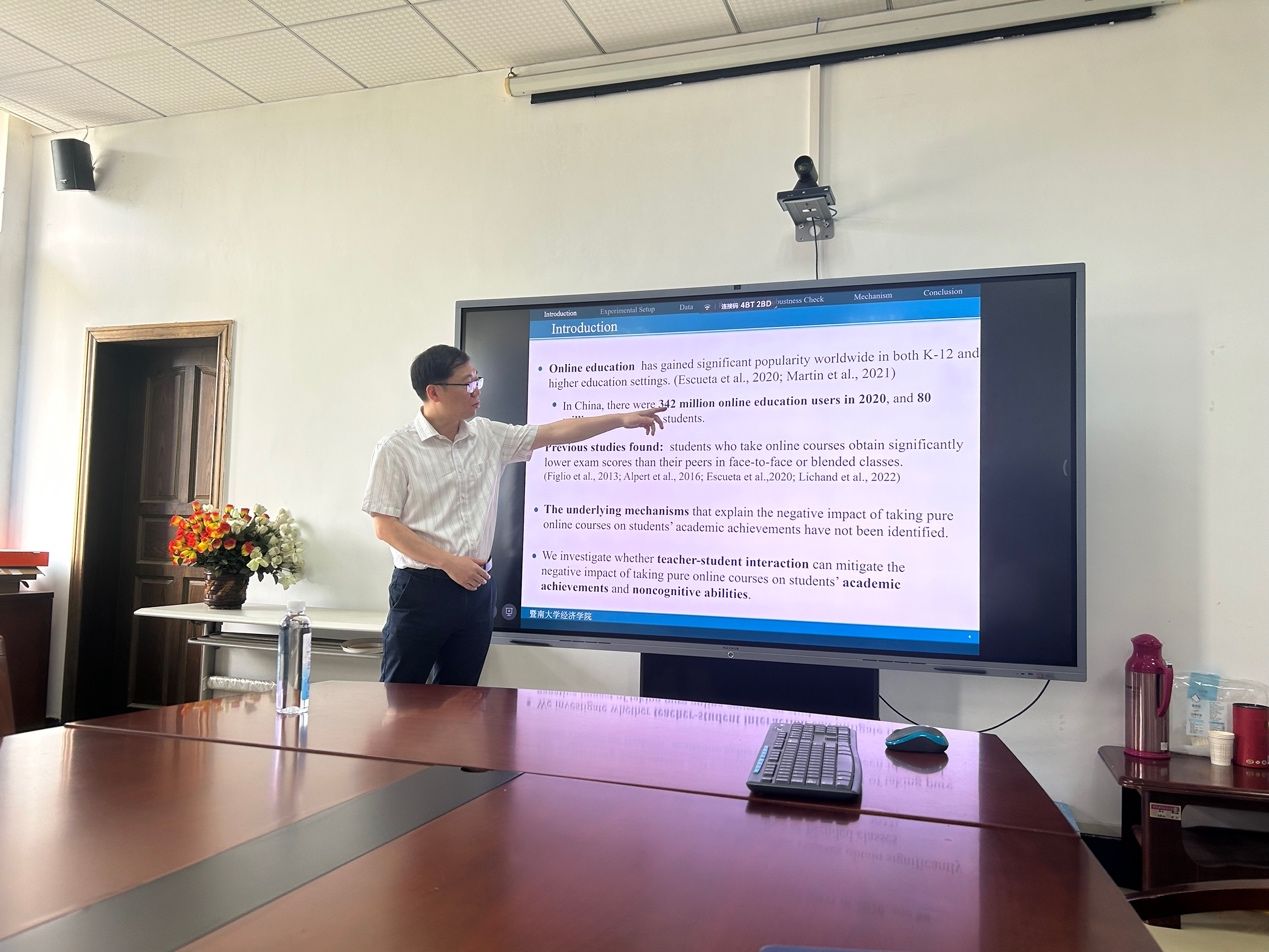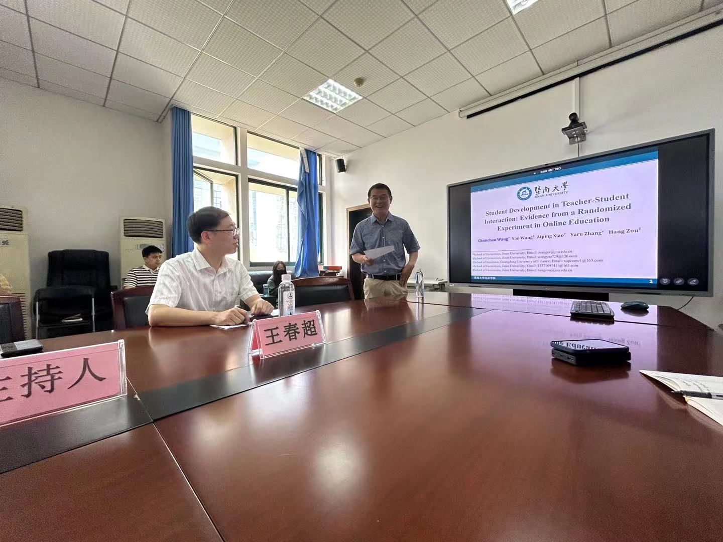 2024年6月6日上午9:00,经济中南“文澜高端论坛系列活动”第58期讲座在文泉楼南207会议室成功举办。本期特邀暨南大学三公牌 院长王春超教授作为主讲嘉宾,三公牌 院长石智雷教授担任主持人,讲座主题为“Student Development in Teacher-Student Interaction: Evidence from a Randomized Experiment in Online Education”。三公牌 周强副教授、潘峣副教授、叶琴博士、袁璐璐博士等30余名师生参加了本次讲座。