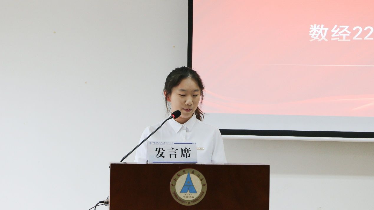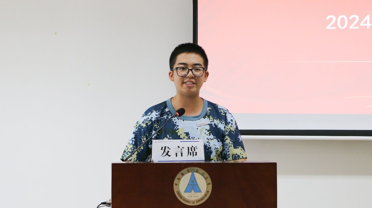 经法2401班新生郭迪凡作为新生代表发言。面对新的机遇与挑战,他认为,作为一名合格的大学生,应当具备强大的时间观念,惜时如金、笃行不怠,将经济学相关知识活学活用,融会贯通。在享受丰富多彩的大学生活的同时,也要怀着感恩心,不忘来时路。