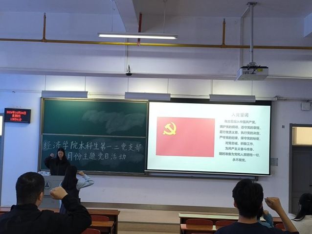 会议第一项,第二支部组织委员胡瑜佳同志带领两个支部全体党员同志重温入党誓词。在重温入党誓词后,樊羽嘉同志带领全体党员集中温习了《中国共产党章程》第五章——党的地方组织的第三十条至第三十二条,加强了支部党员的党性修养。