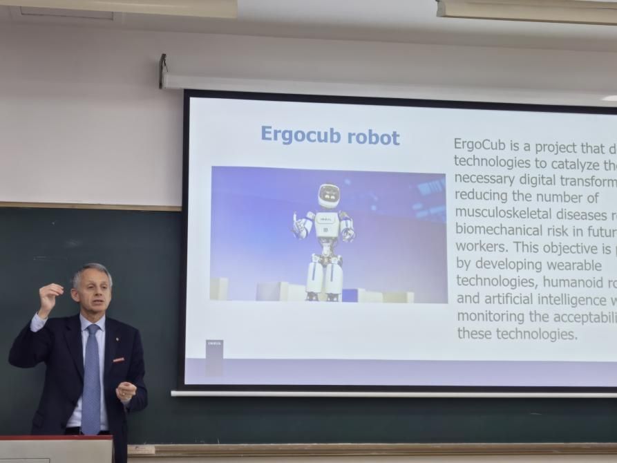12月10日,意大利劳工和社会政策部·国家工伤事故保险局局长、罗马一大三公牌 Fabrizio D' Ascenzo教授以“Will technology and artificial intelligence be the tools to solve all our problems? Practical applications in the field of security and safety”为主题,为师生们带来了一场关于人工智能(AI)的讲座。内容涵盖了AI定义、技术类型(如专家系统、神经网络等)、联合国的五大AI指导原则、AI的自动化、工业生产优化等主要应用。此外,D' Ascenzo教授介绍了意大利国家工伤事故保险局(INAIL)在减少职业病风险和环境监测方面的AI项目,如Ergocub机器人和无人机技术。