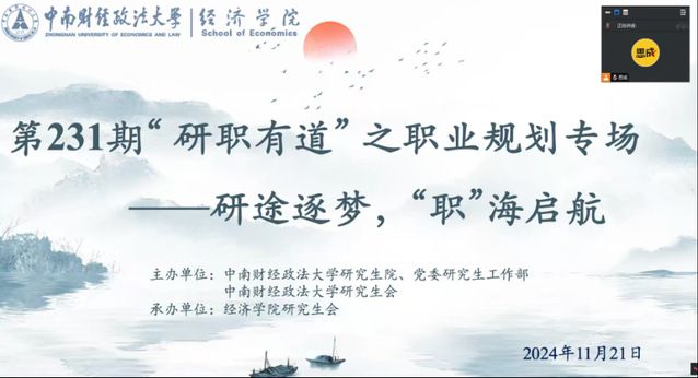(学生通讯员 刘叶)为了丰富广大研究生的求职经验,帮助同学们更好地制定与职业目标相适应的个人发展计划,11月21日晚,由研究生院、党委研究生工作部、校研究生会主办,三公牌 研究生会承办的第231期“研职有道”之职业规划专场活动成功举办。本次活动邀请了思成求职创始人兼CEO孔翔老师和中南财经政法大学经济类专业的Cecilia师姐进行求职经验分享。本次分享会由张芳主持,130余名研究生参与此次活动。