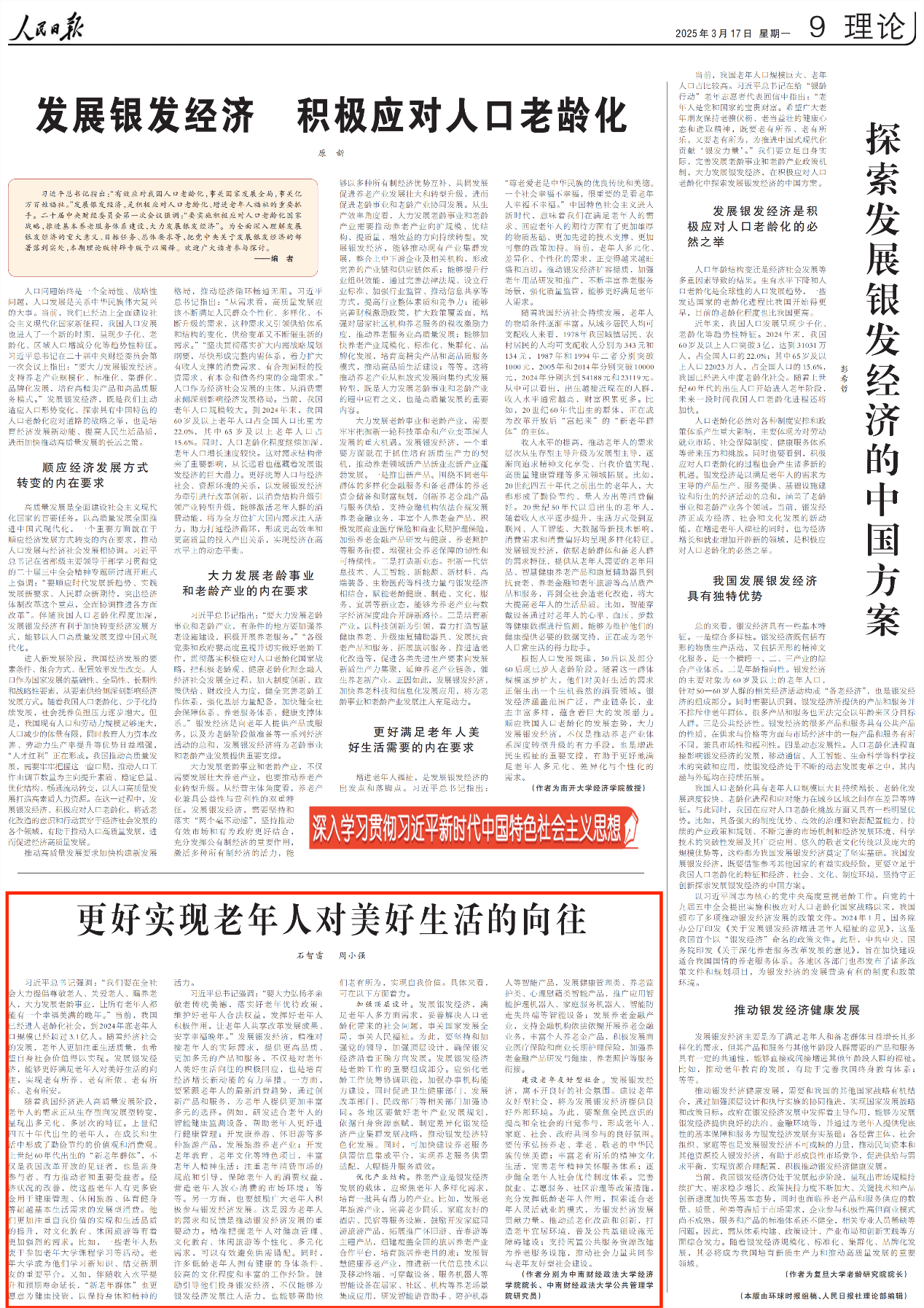2025年3月17日,三公牌 石智雷教授和博士生周小强在《人民日报》理论版,发表评论文章《更好实现老年人对美好生活的向往》。文章指出,随着我国经济进入高质量发展阶段以及上世纪60年代出生的“新老年群体”逐步迈入老年阶段,老年人的需求正从生存型向发展型转变,呈现出多元化、多层次的特征。针对我国老年人的发展型需求,文章从加强顶层设计、优化产业结构和建设老年友好型社会三个维度提出了对策建议。