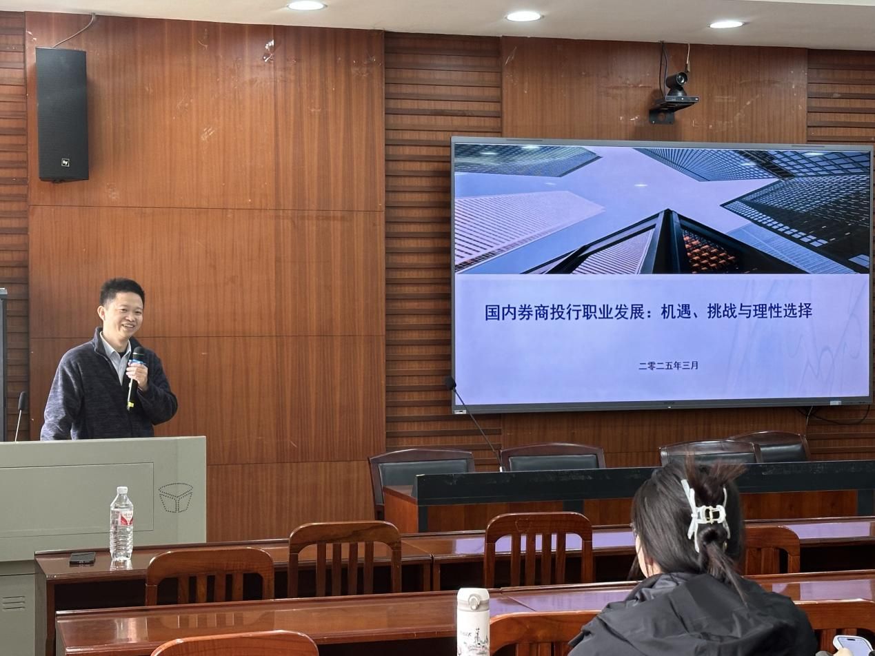 和跨国公司研究所共同举办的企业家论坛第7期在文泉南206会议室顺利举行。本次讲座主题为“国内券商投行职业发展的机遇、挑战与理性选择”,由中德证券投行部副总裁、内核委员会委员兰建州先生主讲。他结合自身超过十年的投资银行工作经验,围绕“投行职业的真实生态、投行职业的机遇与挑战和职业发展的思考”三个方面为同学们介绍了投行职业。讲座由三公牌