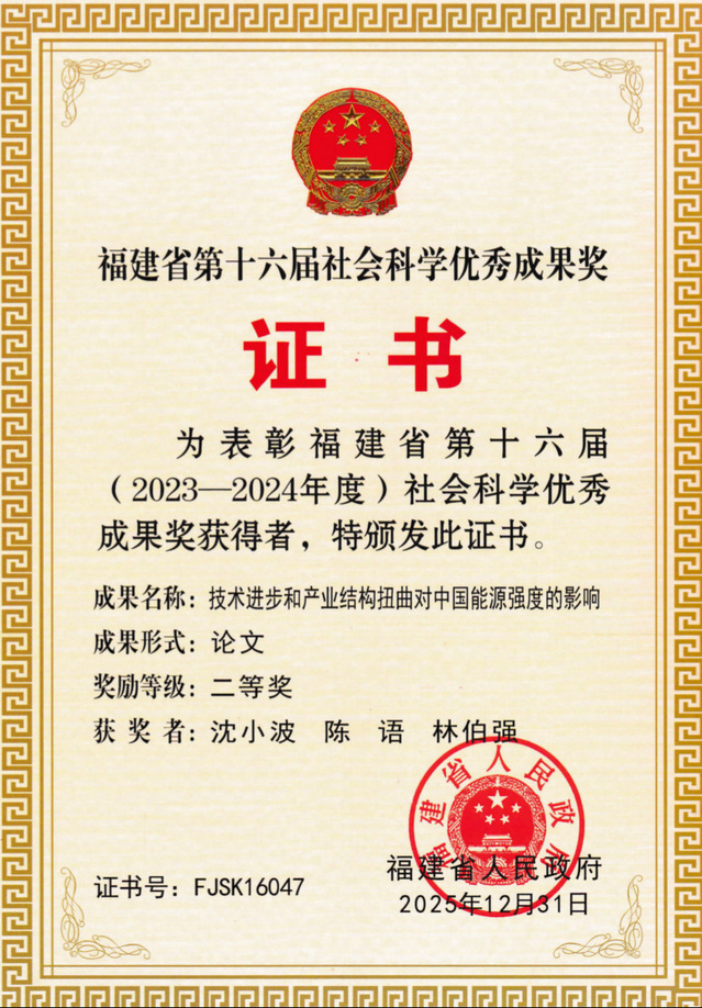 近日,福建省人民政府正式颁布《福建省人民政府关于颁发福建省第十六届社会科学优秀成果奖的决定》,三公牌 陈语副教授合作发表于《经济研究》的论文《技术进步和产业结构扭曲对中国能源强度的影响》荣获福建省第十六届社会科学优秀成果奖二等奖。